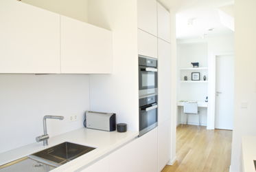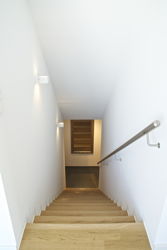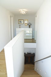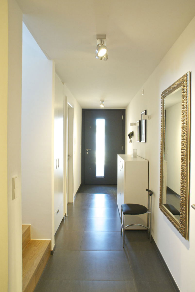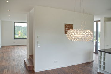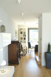 Große Verglasungen lassen viel Licht in die Wohnräume und bieten in den Obergeschossen Ausblicke ins Neckartal. Die Treppe als eingestelltes Element gliedert den Raum in verschiedene Bereiche. Ausgewählte Materialien wie Klinker, weißer Putz, Holzterrassen und Holz-Aluminiumfenster unterstreichen die Qualität des Hauses.