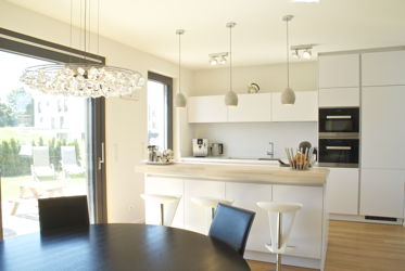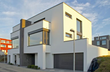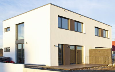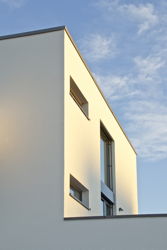 Klare Formen prägen den kubischen Baukörper mit Flachdach. Weiße Putzbänder ziehen sich an der
