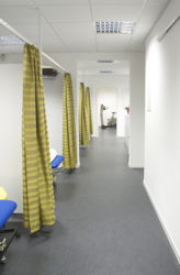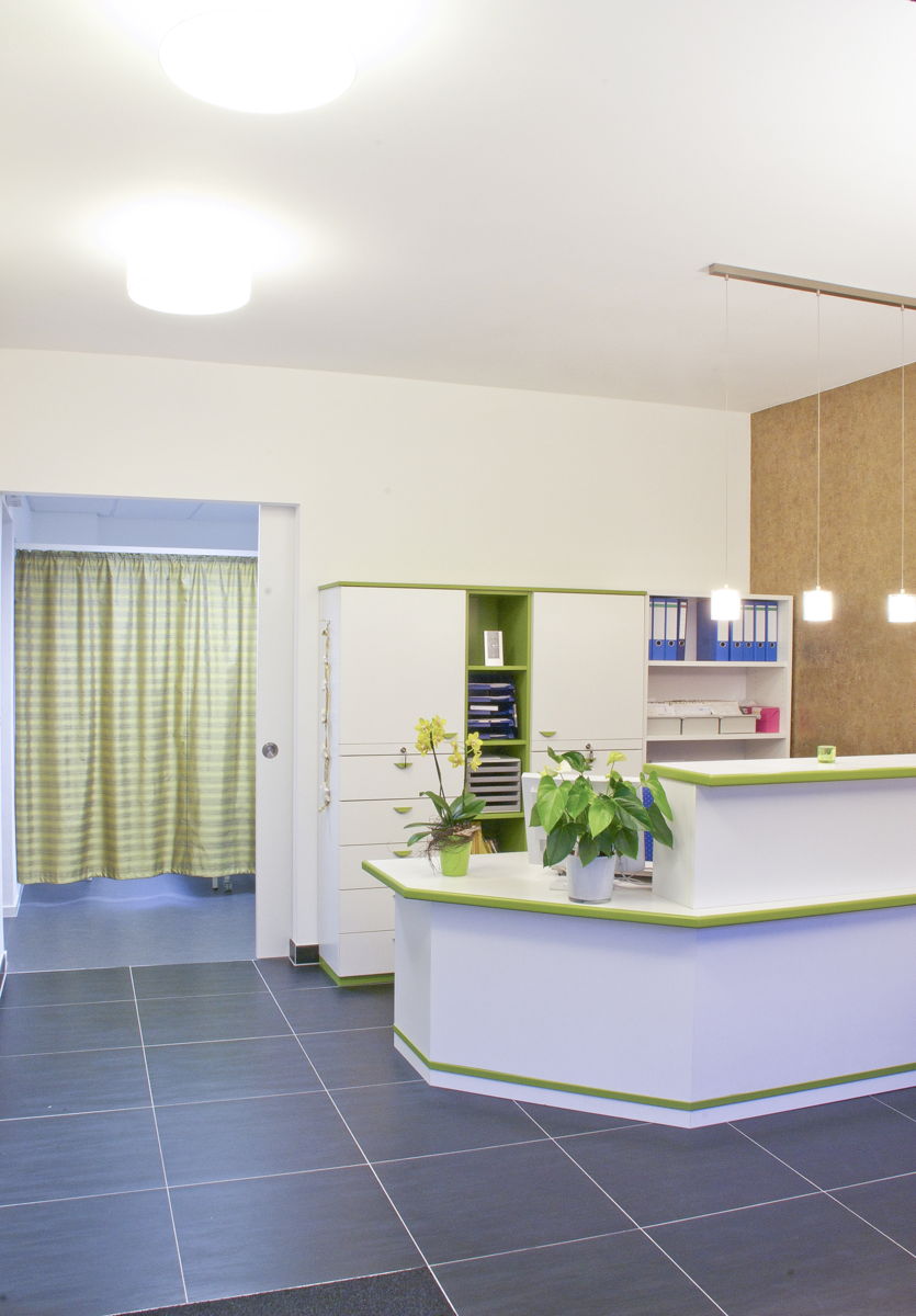 Mit begrenztem Budget wurde mit einfachen Mitteln durch sorgfältig ausgewählte Oberflächen eine angenehme Atmosphäre geschaffen. Die bereits vorhandenen Physio-Geräte und Büromöbel sollten wiederverwendet und integriert werden.