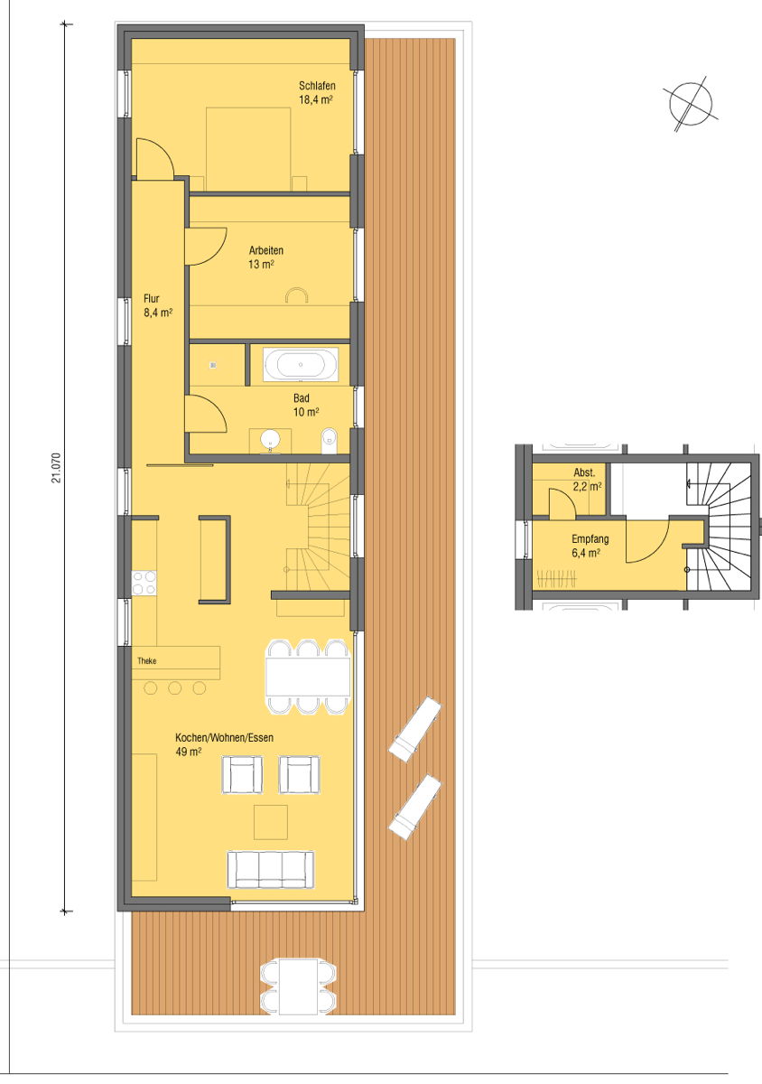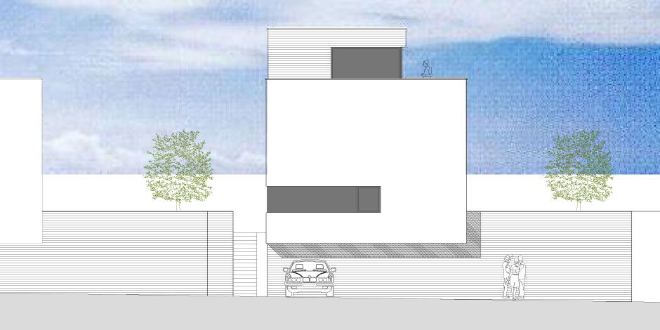 Anstatt von 3 Reihenhäusern verfolgt der Entwurf eine großzügigere und moderner Aufteilung in 2 Maisonettwohnungen mit offenem Koch-/Ess- und Wohnbereich mit Luftraum und ein Penthouse mit Dachterrasse. Der klare weiße Kubus besticht durch seine großzügigen Öffnungen.