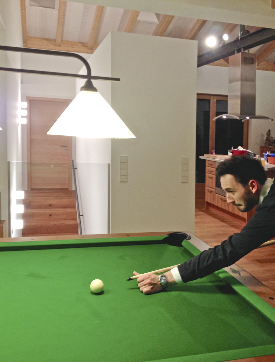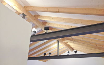 Eine offene und sichtbare Dachkonstruktion aus Stahl und Holz zeichnen den großzügigen Wohnbereich im Hauptbaukörper aus und verleihen ihm einen Kirchenschiffartigen Charakter. Ein eingestellter Küchenblock trennt die Treppe vom offenen Wohnraum.