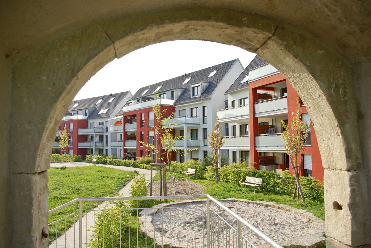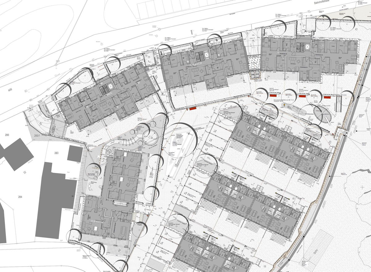 Das Grundstück wird seitlich durch den Schloßgarten mit seiner Stadtmauer begrenzt. 3 Mehrfamilienhäuser mit 33 Wohnungen und darunter liegender Tiefgarage grenzen das große Grundstück zu den gegenüberliegenden Bahngleisen ab und bilden im Süden einen grünen Innenhof. Die roten Vorbauten im Süden der Mehrfamilienhäuser heben sich vom Hauptbaukörper ab und sind gleichzeitg ‚Standbein‘ für die seitlich angrenzenden großzügigen Balkone und Plattform für die Dachterrassen mit Südausrichtung.