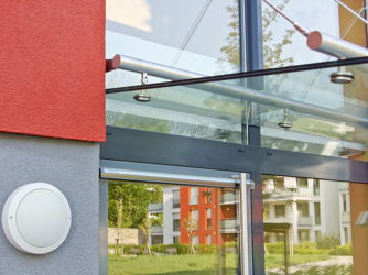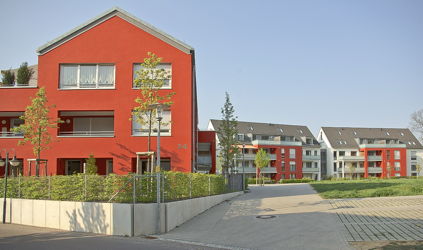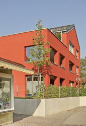Das an der westlichen Grenze befindliche Gebäude beherbergt 9 Betreute Wohnungen. Die rote Farbe und die klare Formsprache des Baukörpers mit Dachterrassen heben das Gebäude hervor.